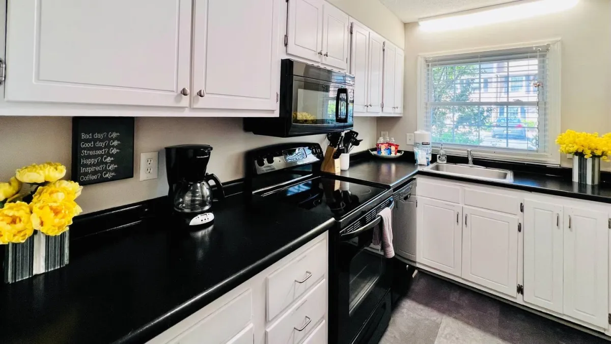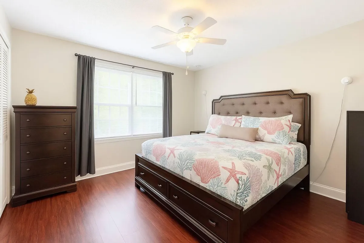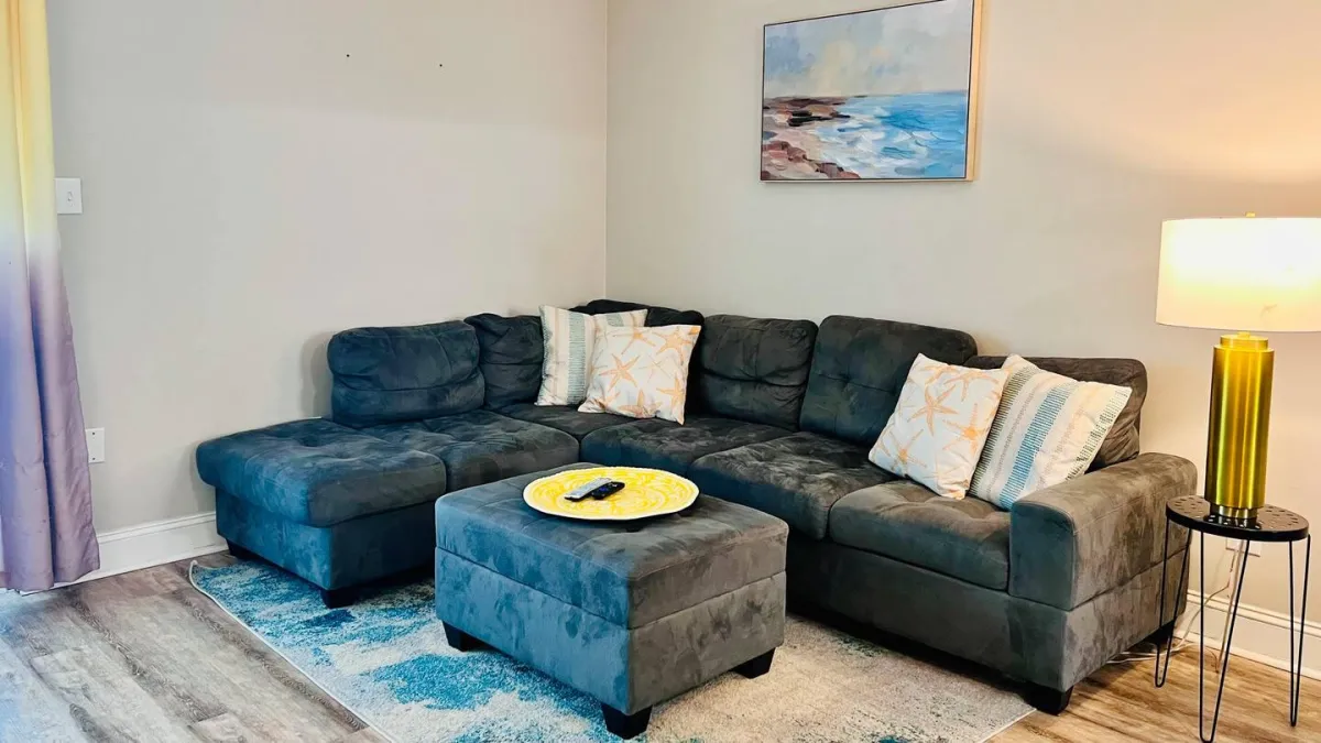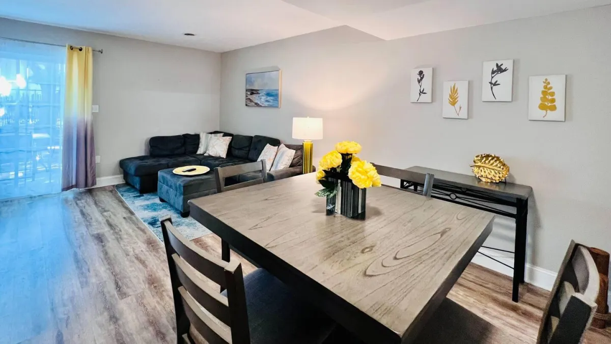Step inside and enjoy a clean, comfortable, and thoughtfully decorated space designed for a relaxing stay. This townhome features a cozy living area, an extra-large TV, a counter-height dining table for four, and a semi-private backyard patio. The full-sized kitchen is stocked with essentials, making it easy to prepare meals during your stay.